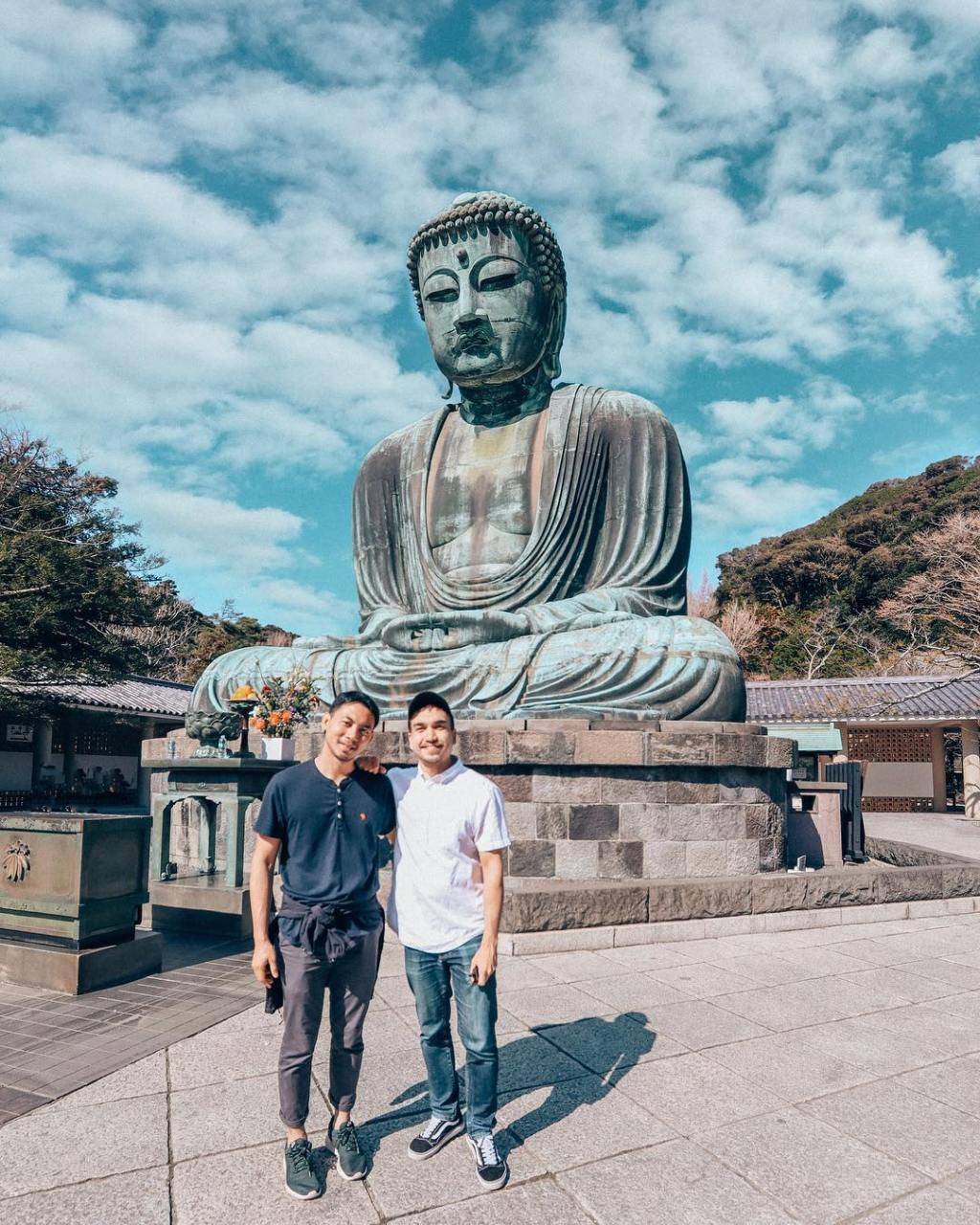 Behind us is majestic, peaceful and massive Great Buddha, a 500-year monumental outdoor bronze statue of Amida Buddha, which is one of the most famous icons of Japan🙏🏼 A must see if you are headed to Kamakura for a day trip from Tokyo or staying in the area itself⚜ It is also known as the second biggest bronze Buddha statue in the country! Isn’t it amazing❓Would you like to see Great Buddha of Kamakura❓