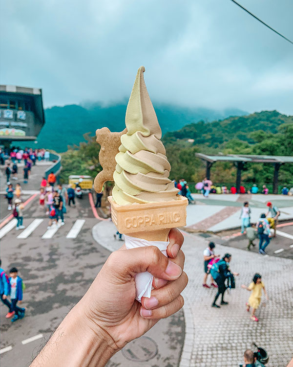 When we had done with our food and tea, we went to explore other places around. We went back to the Maokong Station to walked up to see the tea plantation view and visit the temple. We saw some cats along the way and stopped by to play with them. After, we bought an ice-cream with two types of tea flavor: the left side was matcha green tea and the right side was Taiwanese oolong tea. The oolong tea ice cream had a very unusual taste for an ice-cream but we loved it a lot!
