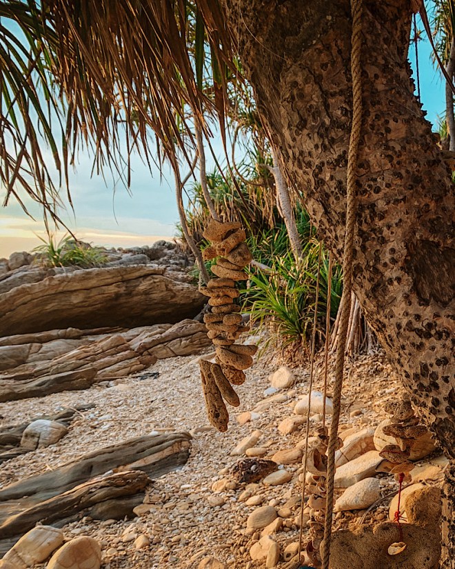 A lot of tourists come to take pictures here, others just chilling. We found some creative art-works, made out the stones. The stones are stacked up several floors (have a look below). Some Thai people believe it will bring them happiness or make their wish come true.
