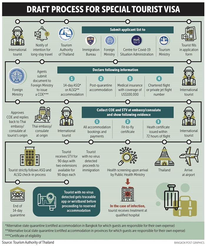For the new tourist visa, you have to provide all required documents to the Thai embassy, including payment for alternative state quarantine (ASQ) or alternative local state quarantine (ALSQ) facility, post-quarantine accommodation, chartered flights or private jet bookings, COVID-free certificate, and travel and health insurance. Visitors must stay for at least 30 days, the first 14 of which are in quarantine in a hotel or resort. After this, and after two more negative COVID tests, travelers can explore more. Anyone wishing to venture further into Thailand must pass the third test after three weeks.