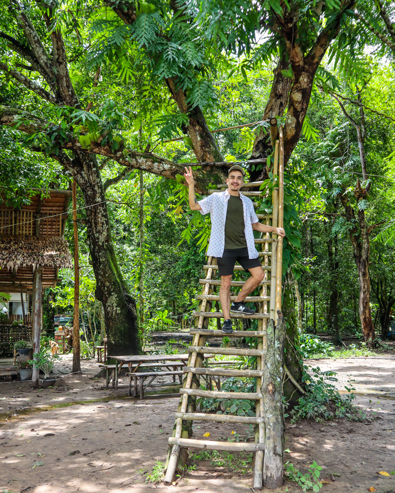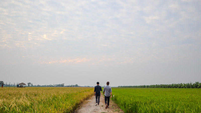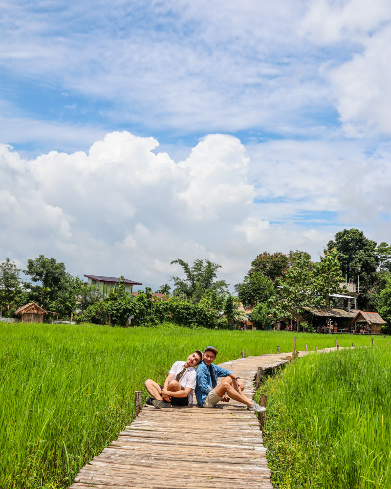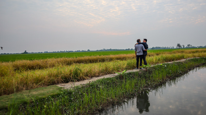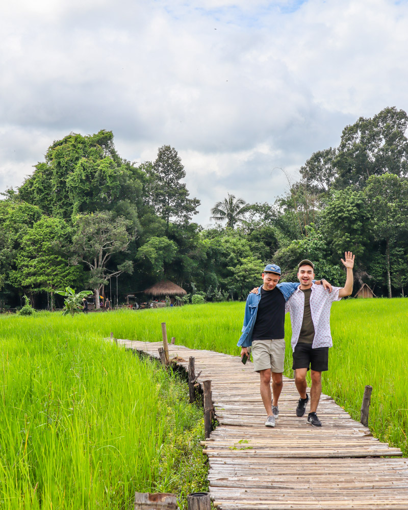 Thung Na Mui Bridge is located at Sarika Subdistrict, Nakhon Nayok Province. Passed on the field of Uncle Aod, the owner of the farm, is more than 150 meters long. We loved the atmosphere with green fields, trees, and mountains.