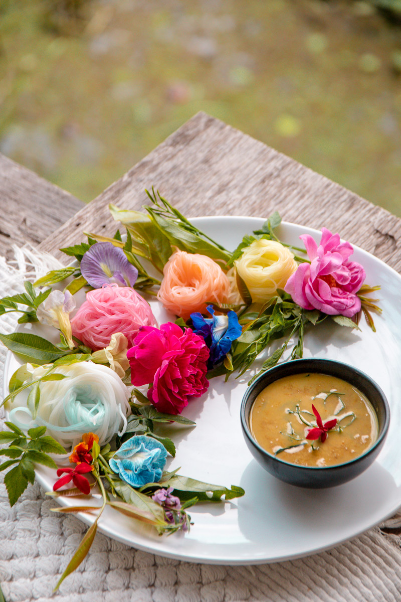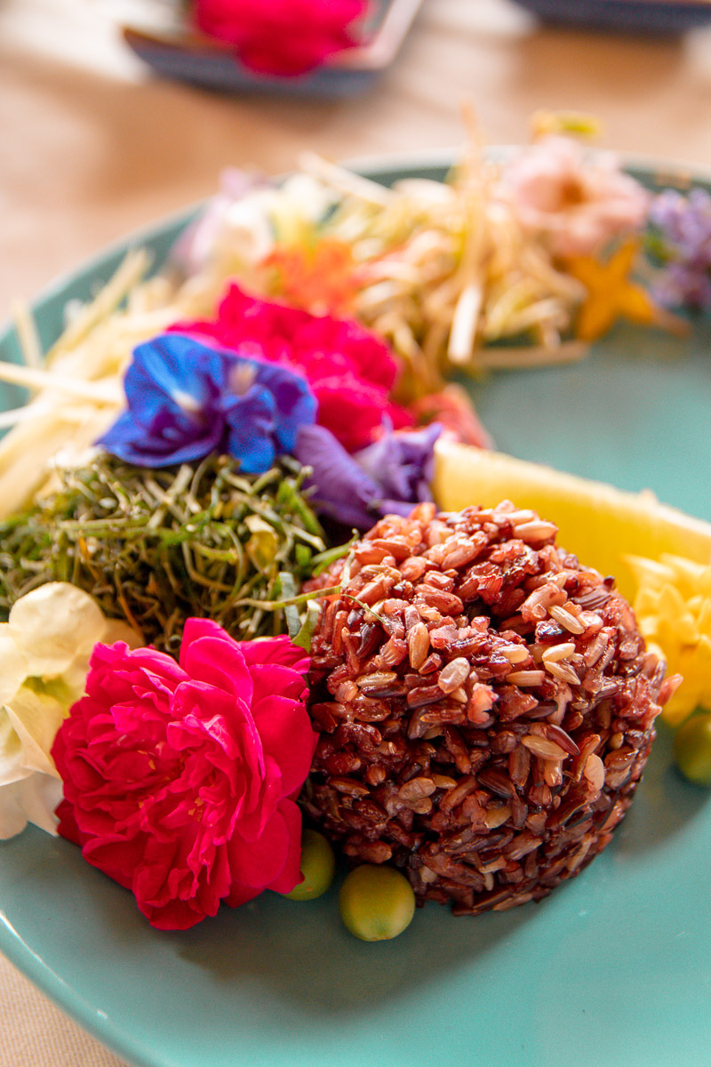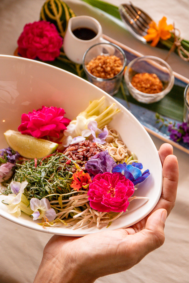 As we said earlier, the flower menu changes according to the season. Altogether Mr. Wilas Julakal has about ten different dishes. The meal course includes around 5-6 dishes. All are made from organic flowers, fresh vegetables, and different rice varieties. Some items, like fish, are seasonal. By the way, the owner doesn’t cook meat but sometimes he uses seafood ingredients like salty shrimps. However, vegan and vegetarian options are available by request, simply inform them during your booking.