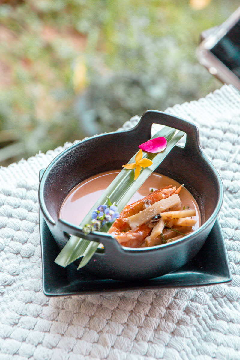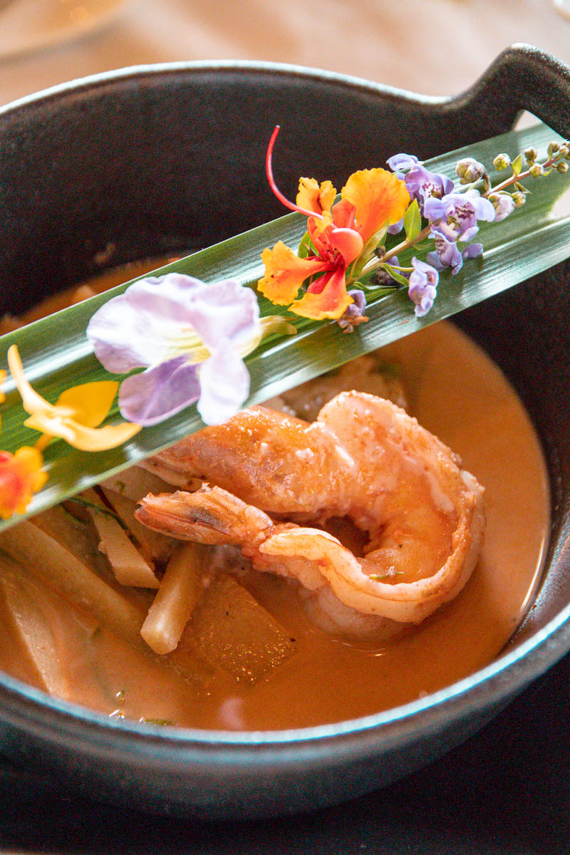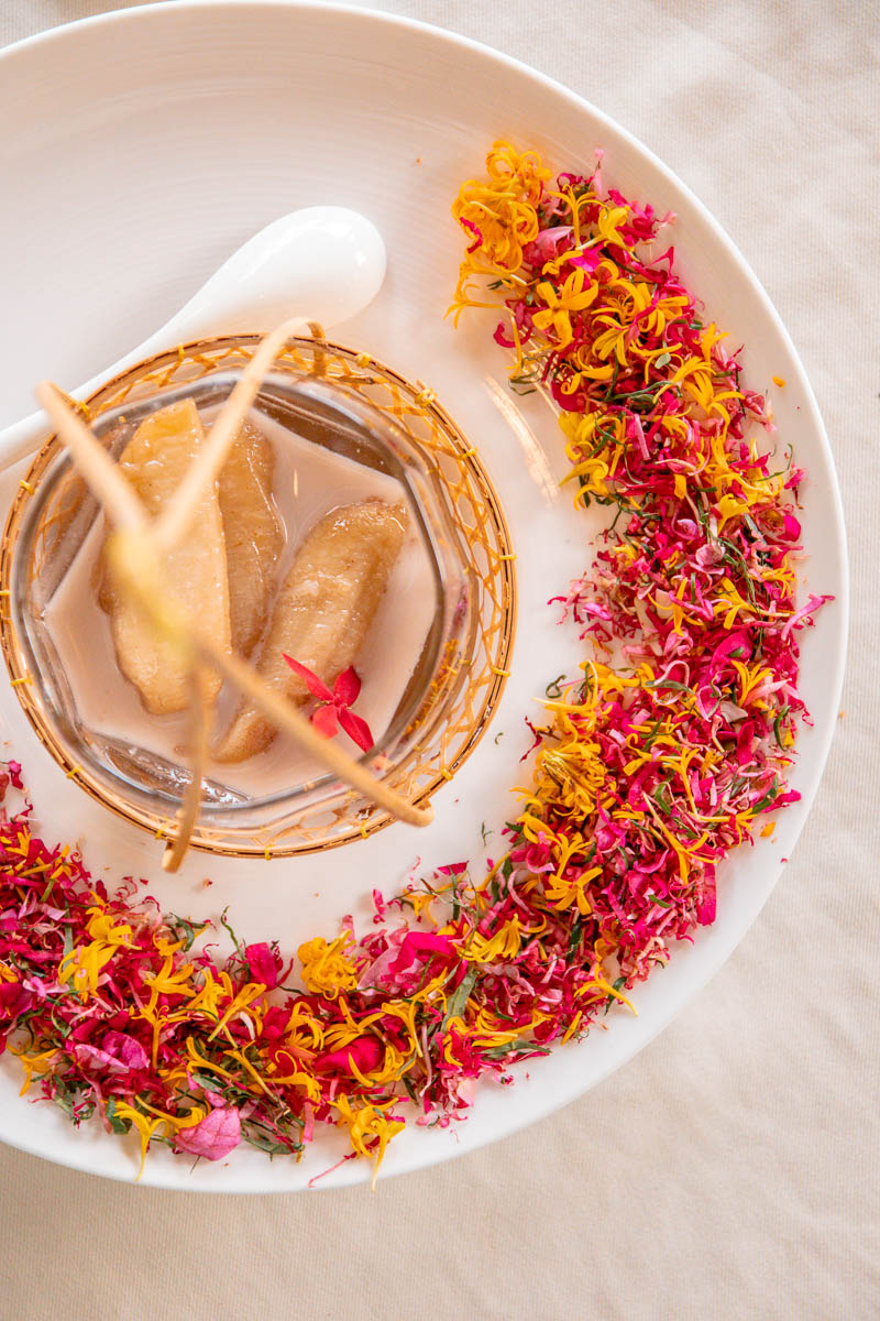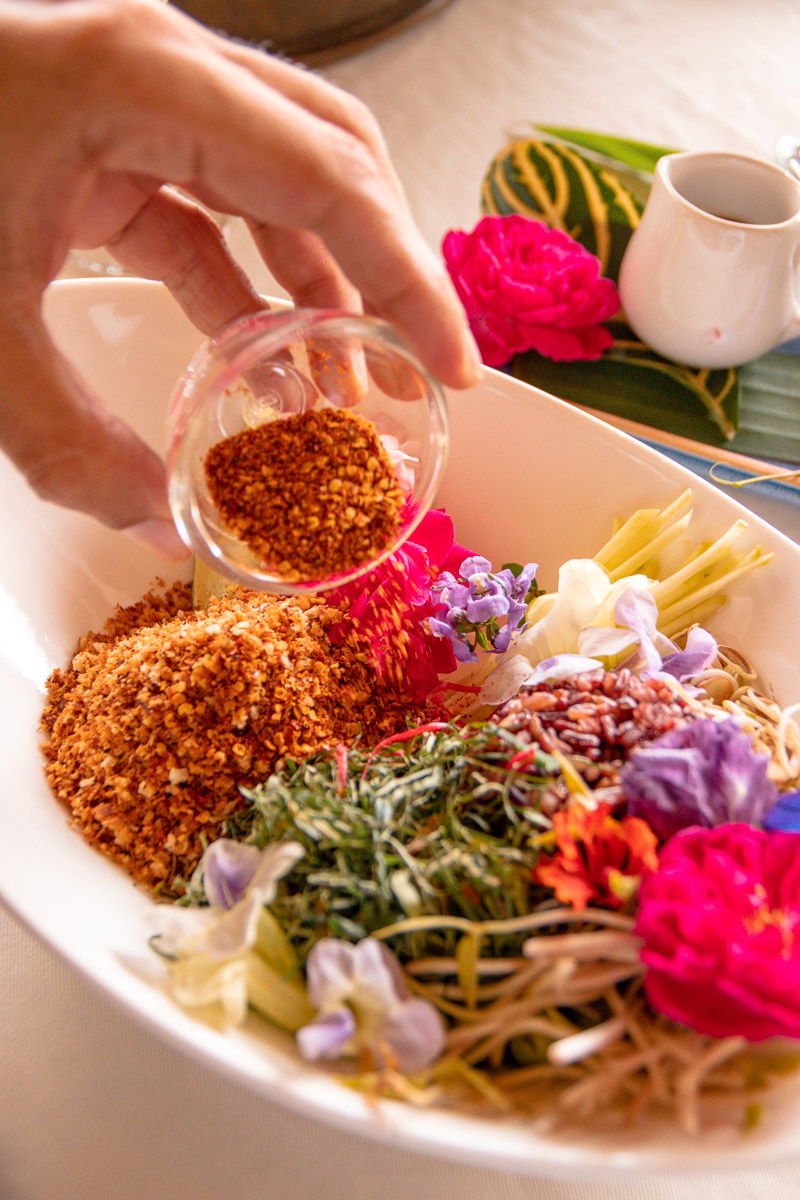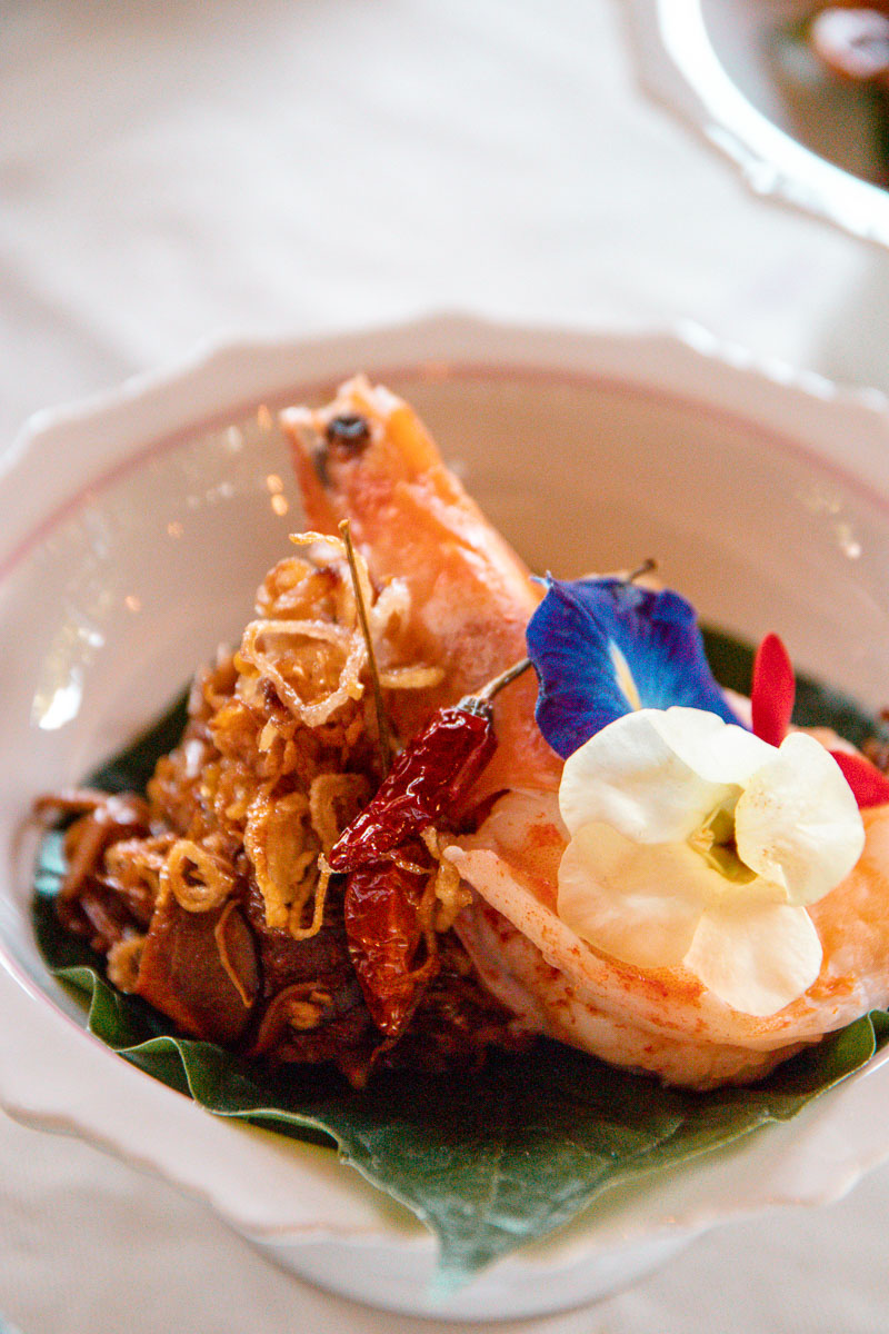 The menu can be different each time but some signature dishes are served every time. For example, the signature starter “Miang Kham”. This snack is entertaining as well since guests are wrapping small pieces of coconut, lime, chili pepper, dried shrimp, mango, and red onion with a special sauce inside the leaf. The addition to traditional “Miang Kham’ is petals were served as wrapping vegetables.