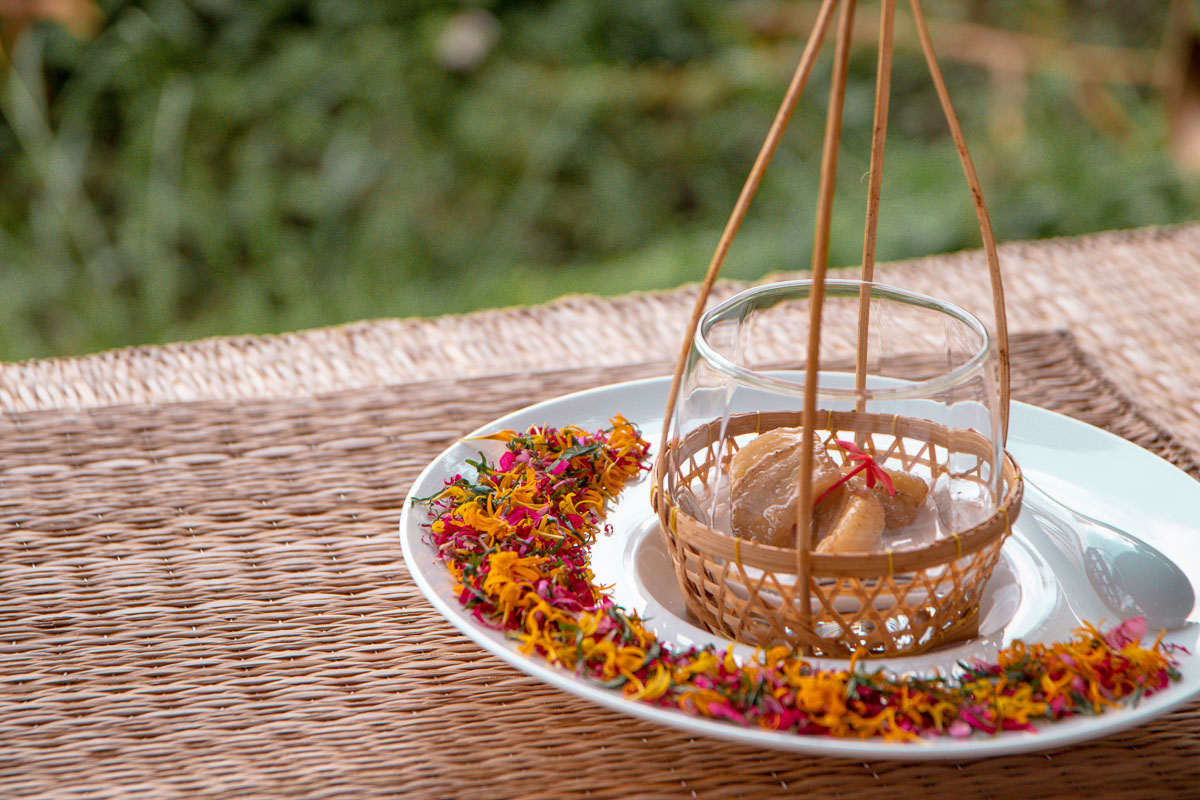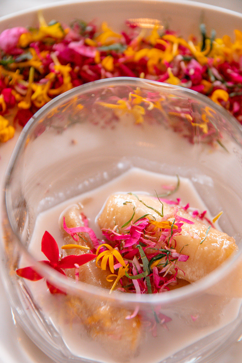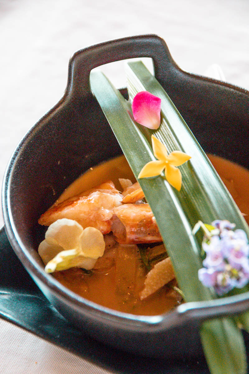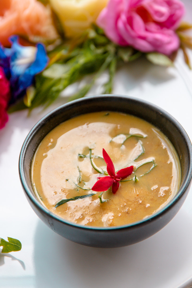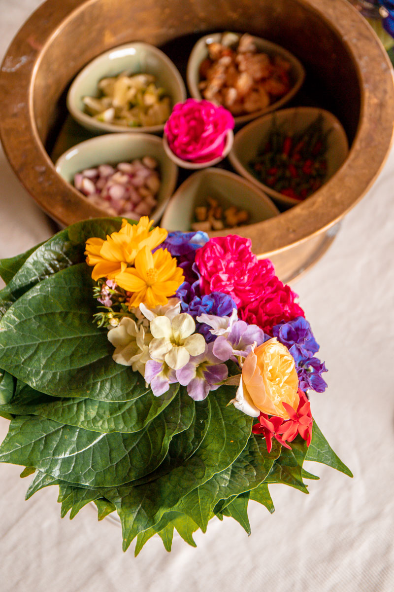 The menu can be different each time but some signature dishes are served every time. For example, the signature starter “Miang Kham”. This snack is entertaining as well since guests are wrapping small pieces of coconut, lime, chili pepper, dried shrimp, mango, and red onion with a special sauce inside the leaf. The addition to traditional “Miang Kham’ is petals were served as wrapping vegetables.