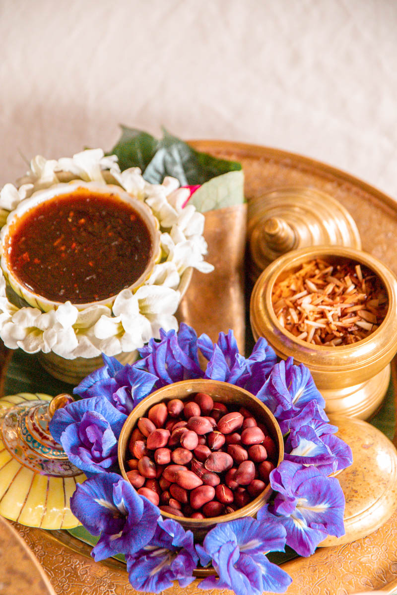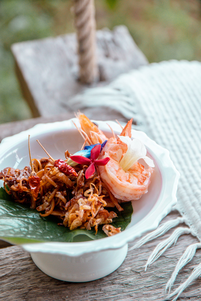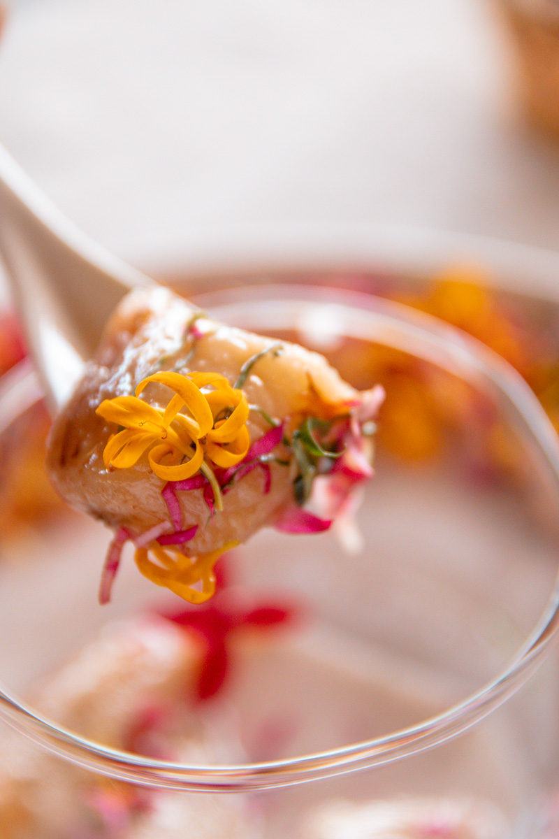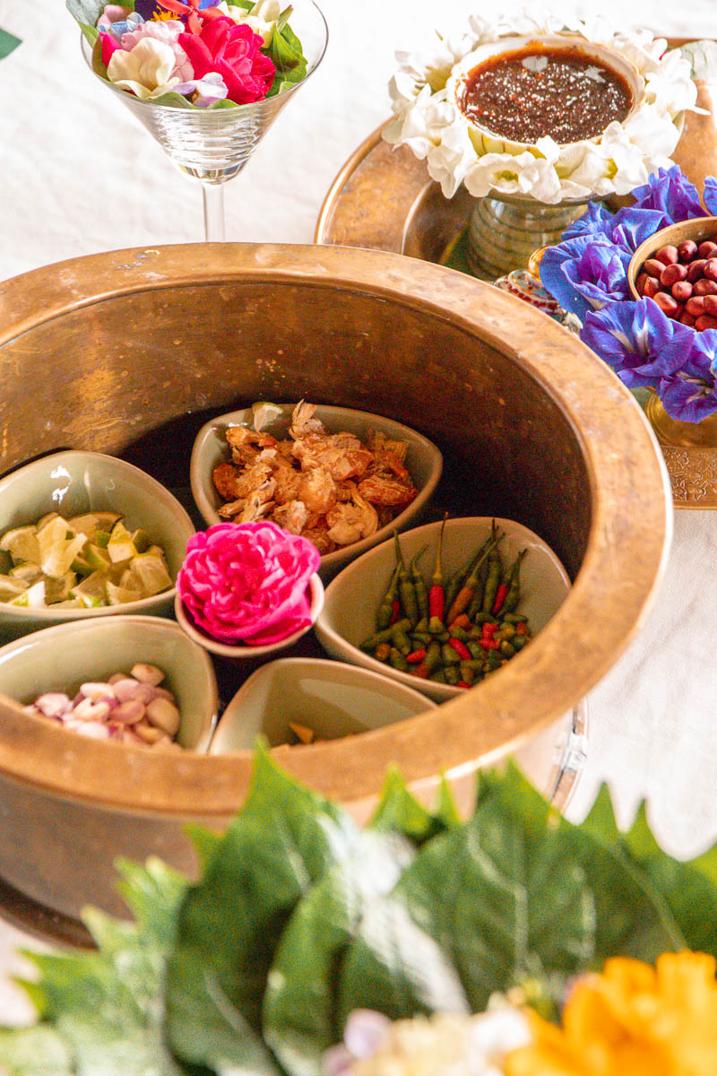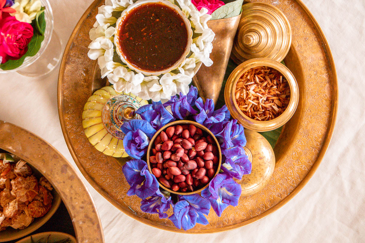 The menu can be different each time but some signature dishes are served every time. For example, the signature starter “Miang Kham”. This snack is entertaining as well since guests are wrapping small pieces of coconut, lime, chili pepper, dried shrimp, mango, and red onion with a special sauce inside the leaf. The addition to traditional “Miang Kham’ is petals were served as wrapping vegetables.