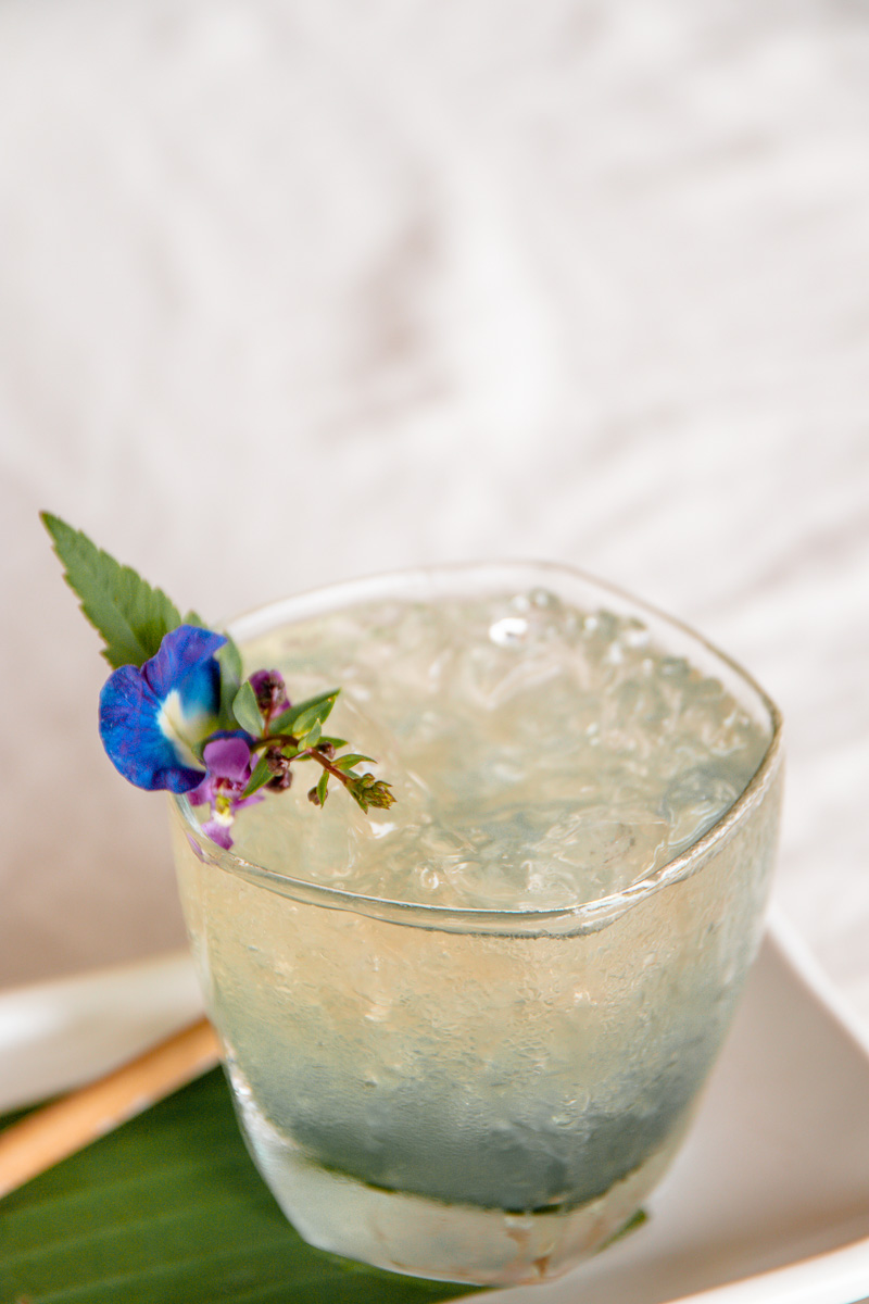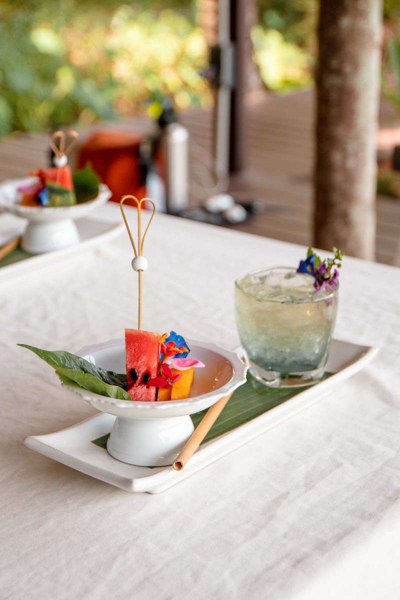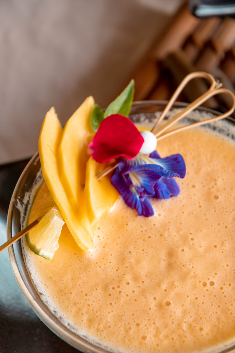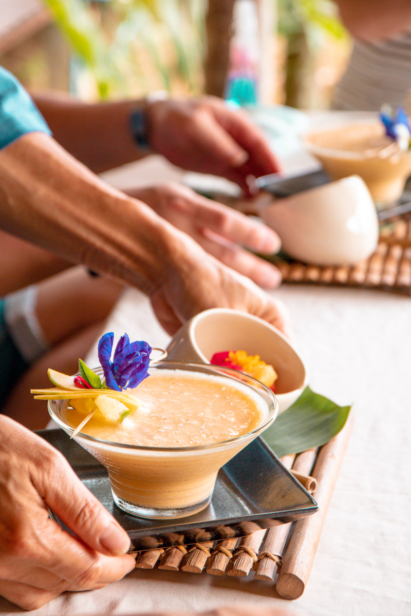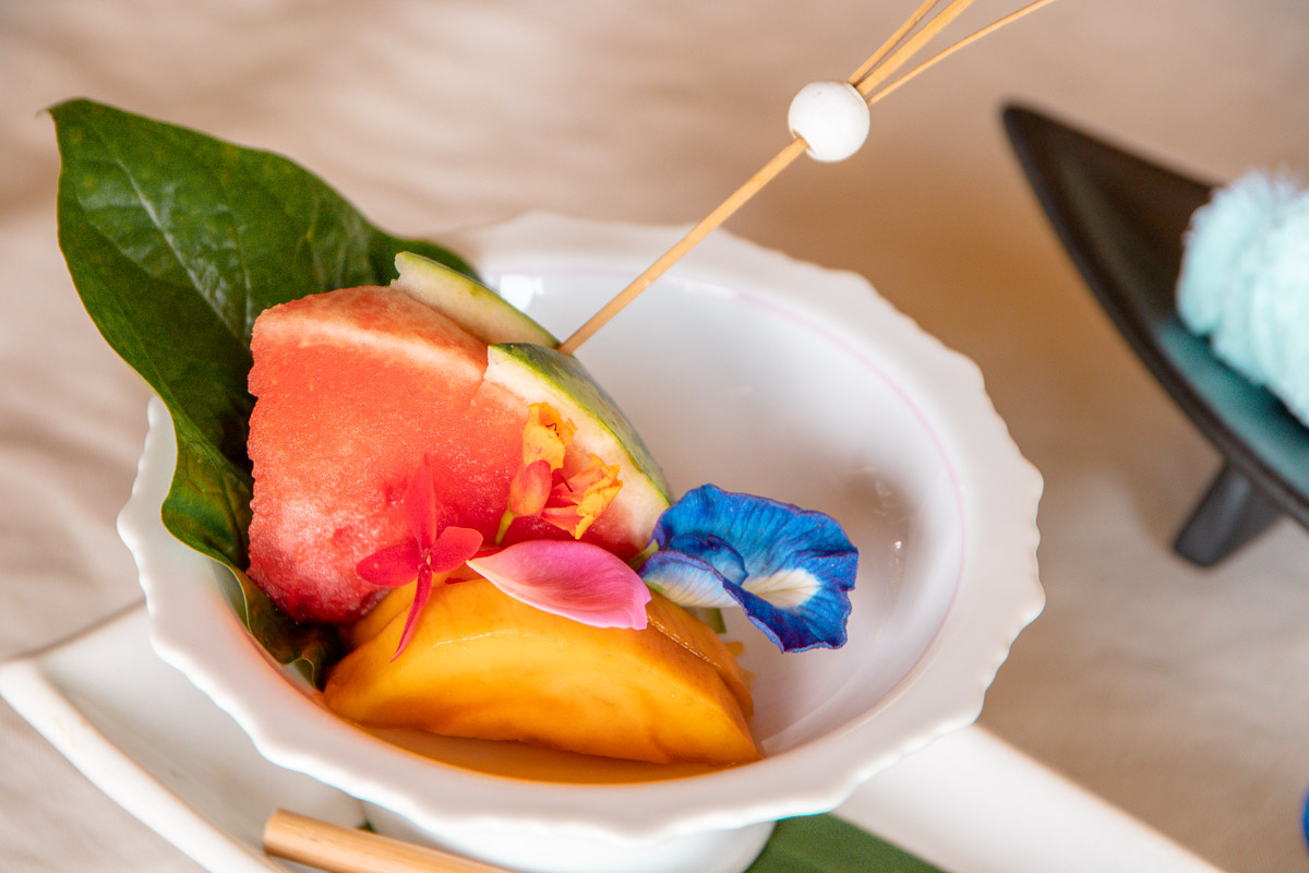 Desserts, drinks, fruits, and flower-infused water are all included in the set. We had a butterfly pea herbal drink and later a mango smoothie. Additionally, we ate a traditional Thai dessert – banana in coconut milk.