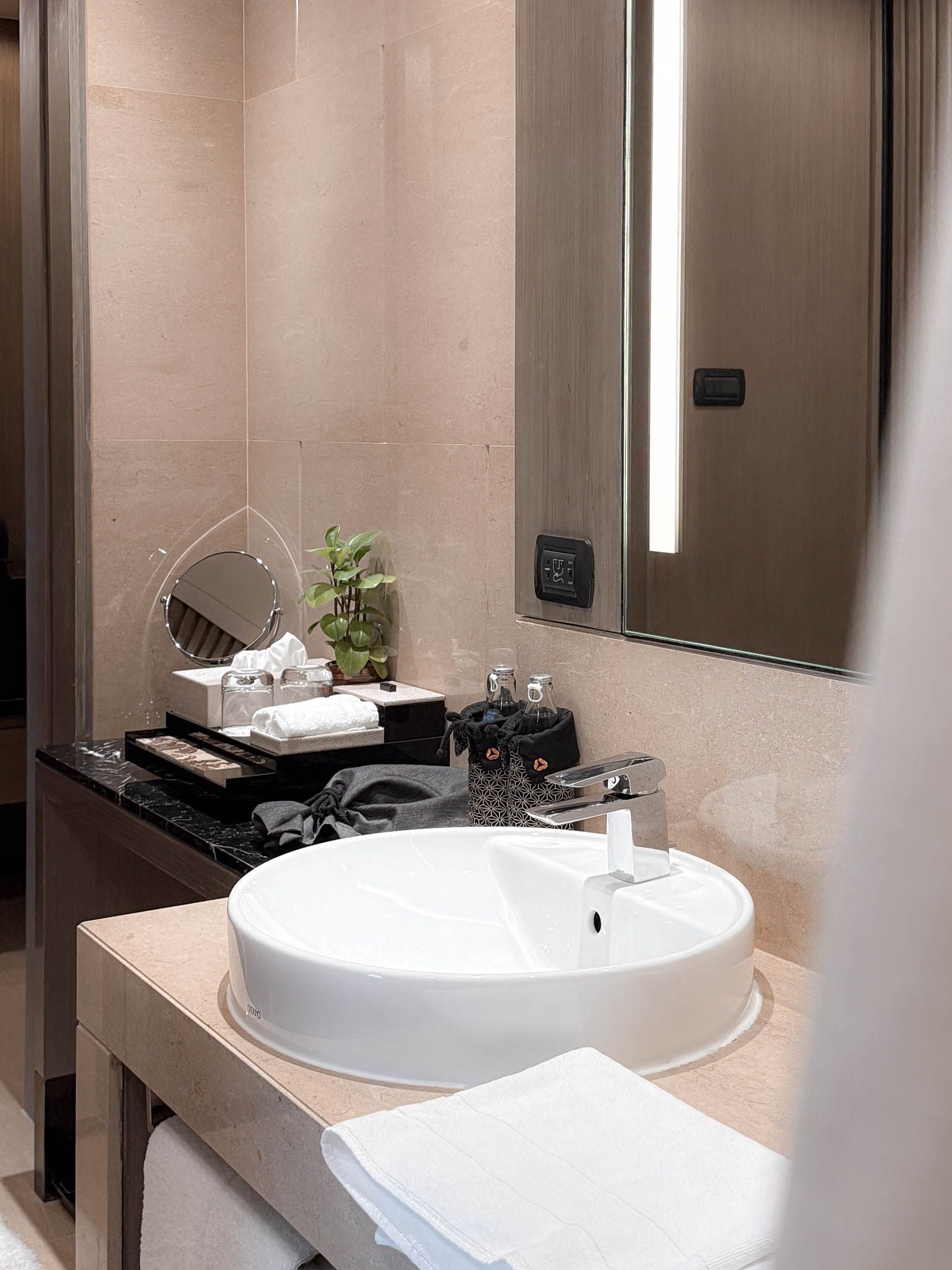 Our Deluxe Suite at The Okura Prestige Bangkok offered what you hope for in a luxury city stay — peace, privacy, and an unbeatable view. The full sweep of Bangkok’s skyline filled the space through floor-to-ceiling windows, with soft natural light setting the tone. Paired with clean Japanese design and warm, minimalist tones, it instantly felt like a place to exhale.