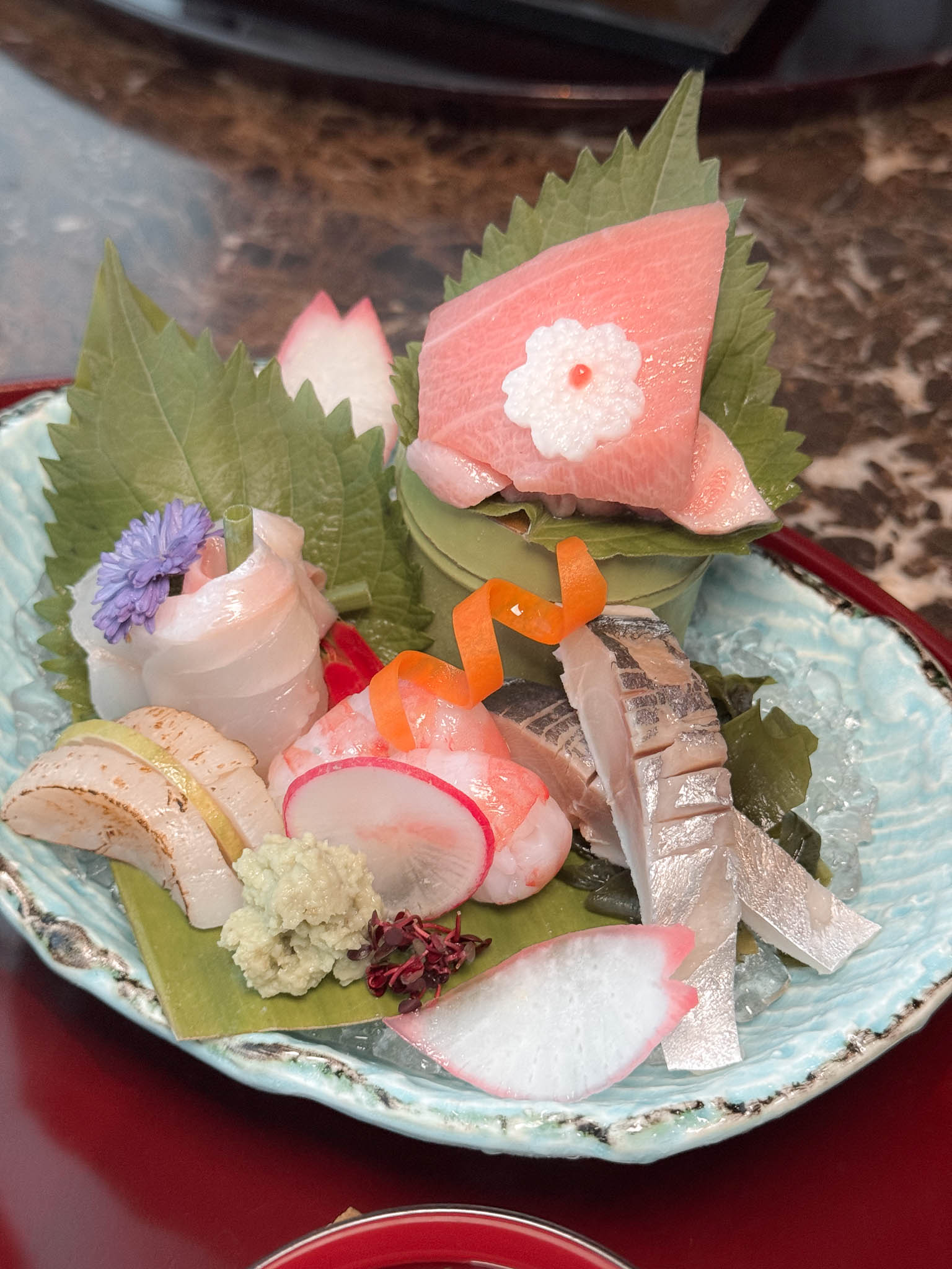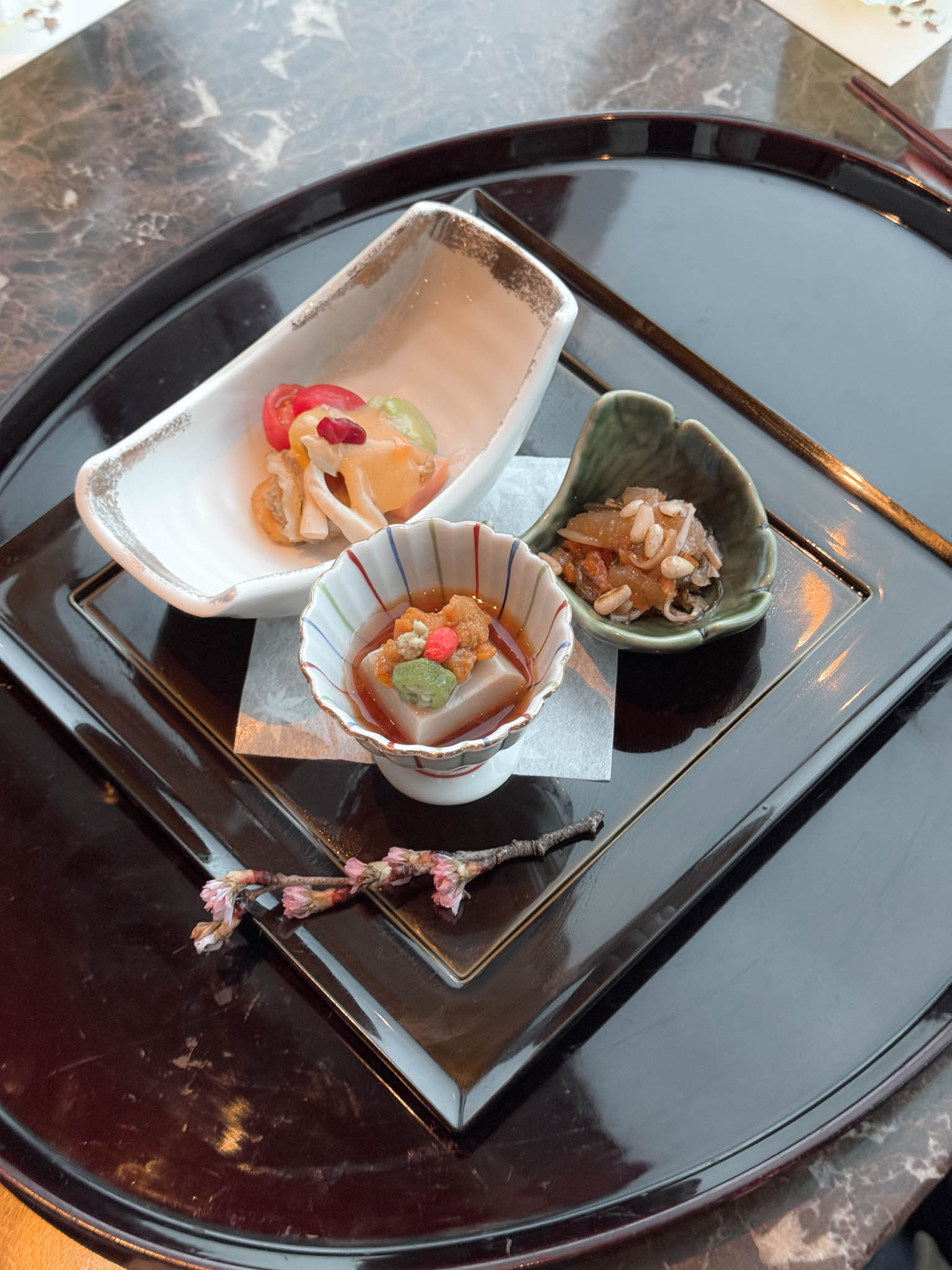 We opted for the Uzuki Kaiseki set menu, which showcased seasonal ingredients across multiple courses, from amuse to dessert. Highlights included glistening sashimi (tuna belly, horse mackerel, scallop aburi), a delicate soup with sakura shrimp and yuzu, and snow fish grilled in sakura leaf — a dish as fragrant as it was tender.